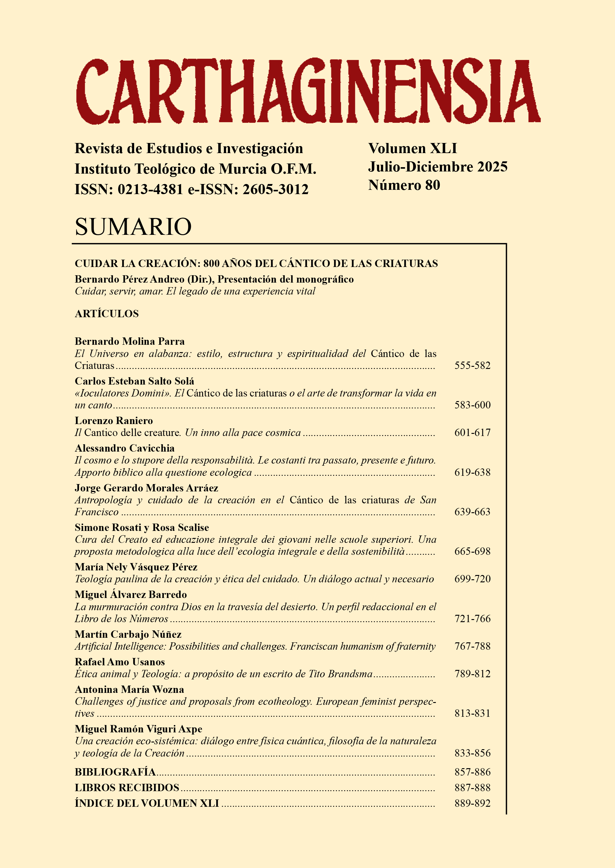 Carthaginensia CARTHAGINENSIA es una revista semestral de la Universidad Pontificia Antonianum. Publica estudios en teología, filosofía, historia eclesiástica y franciscana, franciscanismo, humanismo, ecumenismo, ética, derecho y pensamiento cristiano. -